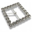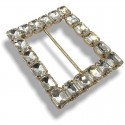 Fibbia di forma rettangolo realizzata con pietre in vetro di color crystal base oro rinforzato. H: 3.8 cm x 5 cm, interno 2.5 cm.