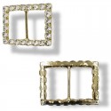 Fibbia di forma rettangolo realizzata con pietre in vetro di color crystal base oro rinforzato. H: 5 cm x 6 cm, interno 4 cm