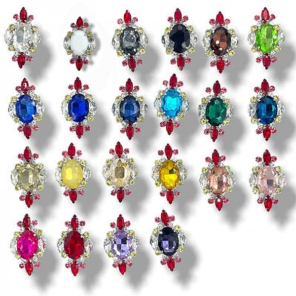 Applicazione realizzata con pietre in vetro di varia forma, misura e colore, il tutto saldato in un corpo unico. N.B. : La variante White e Opal Yellow hanno la pietra centrale in Acrilico. H: 5,5 cm x 3,2 cm