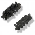Morsetto raffigurante dei Fiori, realizzati con tessuto poliestere lucido, i petali sono ricamati con file di corallini, mentre la corolla è formato da una pietra crystal. Realizzato su base panno lenci. H: 4,5 cm x 9 cm