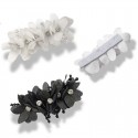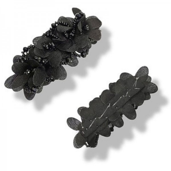 Morsetto raffigurante dei Fiori realizzati con tessuto in poliestere lucido e i petali sono ricamati con file di corallini. H: 4,5 cm x 11 cm
