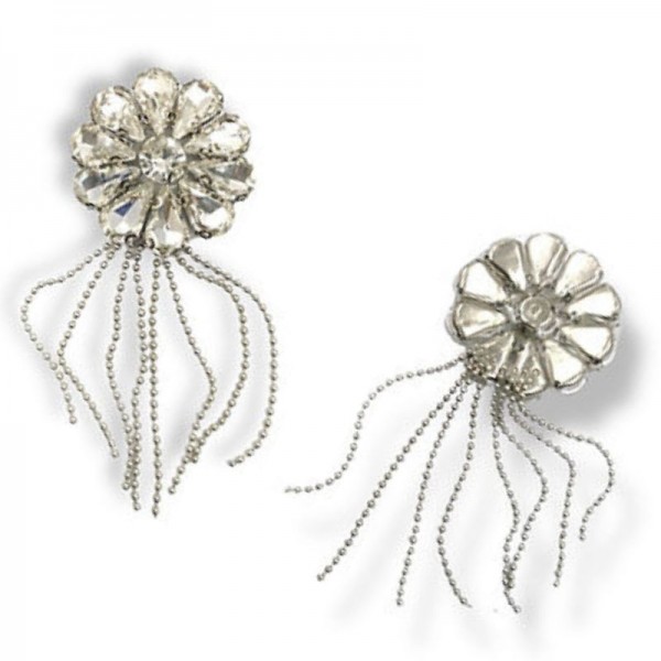 Applicazione termoadesiva raffigurante una Margherita, realizzata su una pellicola adesiva con pietre in vetro castonate, i pendenti sono formati da catenelle di microsfere. H: 3,5 cm x 3,5 cm , pendenti da 5 cm