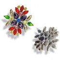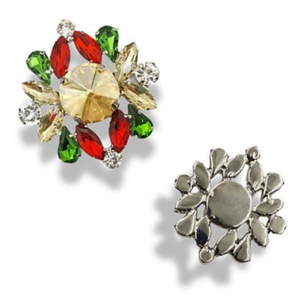 Applicazione a tema floreale, realizzata con pietra centrale color champagne e con pietre di altre forme e colori, saldate a formare un unico corpo.H: 5 cm x 5,5 cm