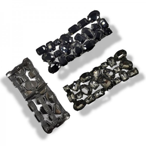 Morsetti realizzati con pietre in vetro con castone rinforzato, saldate e disposte su tre file. H: 4 cm x 9,5 cm