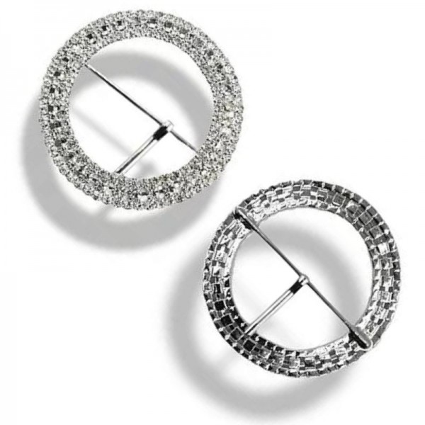 Fibia di forma circolare, realizzata con pietre crystal saldate ed ardiglione. H: 6,5 cm x 6,5 cm, interno 4,5 cm