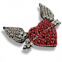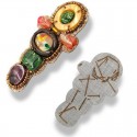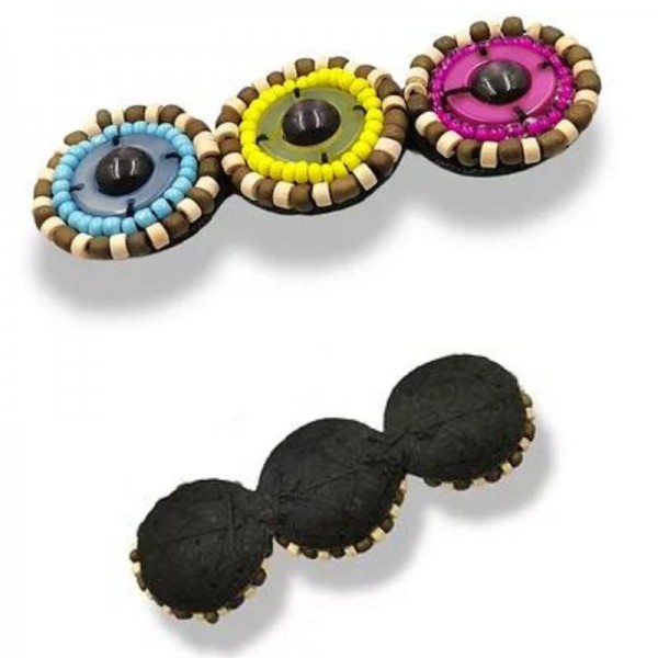 Applicazione circolare realizzata con tre pietre centrali racchiuse da un inserto in plastica e contornate da due file di corallini che ne delineano i bordi. H: 3 cm x 9 cm