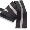 Elastico in poliestere realizzato su fondo nero con tre linee di lurex argento e oro. H: 38 mm