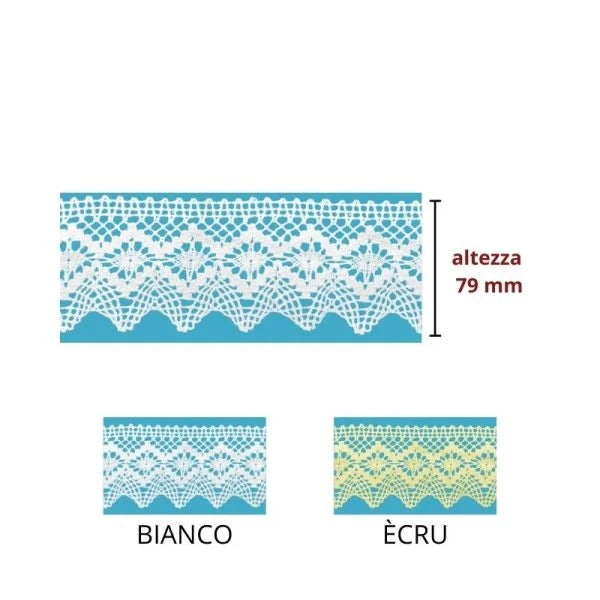 100% cotton bobbin lace, high quality product, size h 79 mm. Price refers to a 10-meter piece (continuously cut at 10 meters)