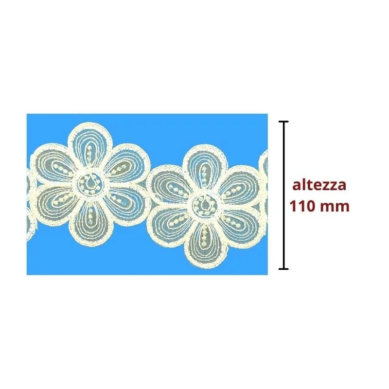 Finely laminated rebrodè tulle lace in 100% polyester, high quality product, size 110 mm. Price per 10 metre piece (continuous cut at 10 metres).