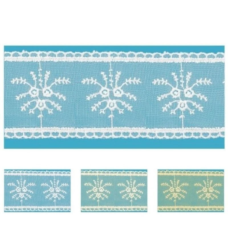 Embroidered lace on tulle, 100% polyester, suitable for clothing or home textiles (curtains, doilies, display cases, etc.), width 6.2 cm. Price per 10-meter piece (continuous cut at 10 meters).