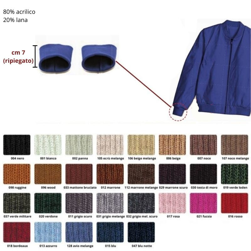 Acrylic Knit Cuffs are an economical solution for replacing worn or damaged cuffs, found on a wide variety of clothing items: sweatshirts, pajamas, tracksuits and jackets, which can be renewed when necessary with cuffs of the same color, texture and density. The replacement edge is made of soft ribbed knit, machine washable and declined. Packaging and price refers to 1 pair