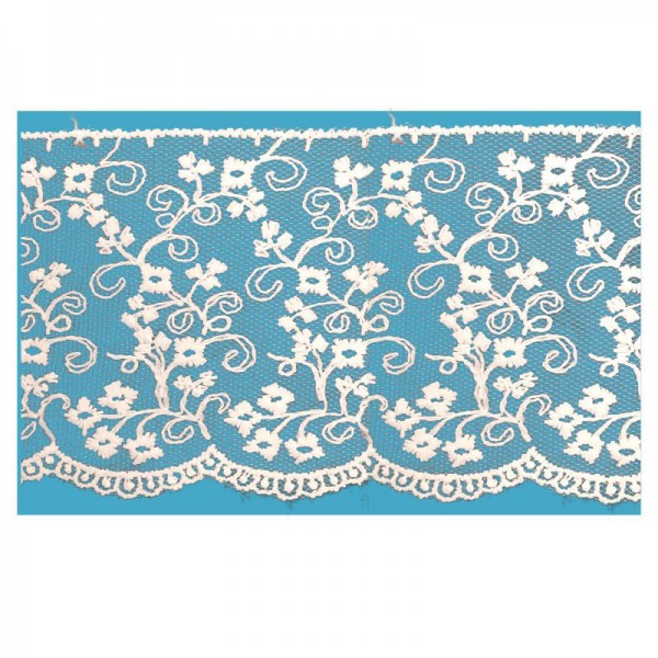 Pizzo ricamato su tulle, in materiale 100% poliestere, utilizabile per abbigliamento o arredo tessile casa (tende, centrini, vetrinette ecc), altezza 70 mm. Prezzo a pezza da 10 metri (taglio continuo a 10 metri).