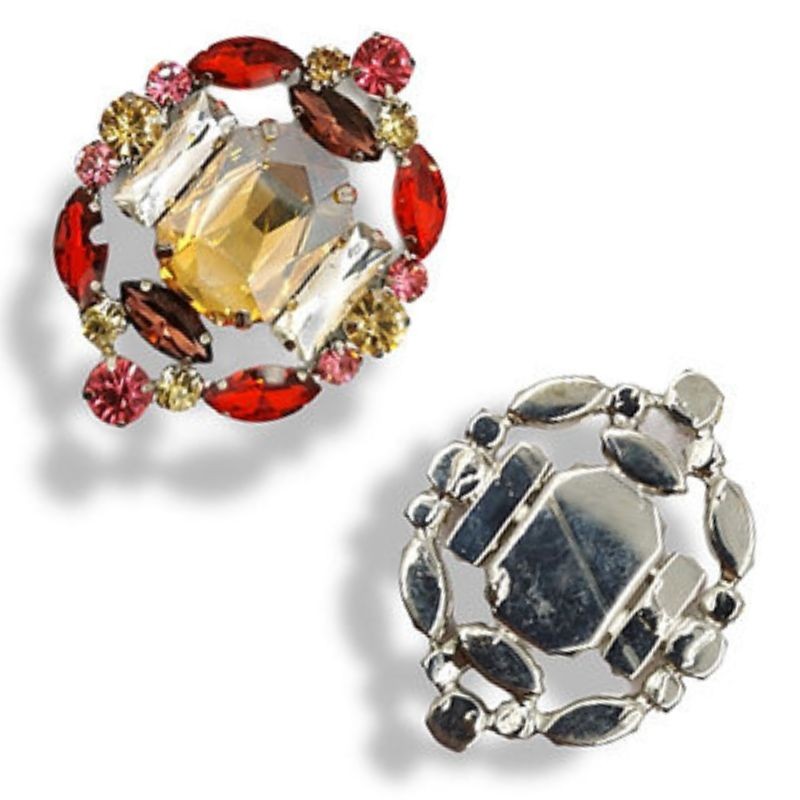 Applicazione realizzata con pietra centrale color champagne e con pietre di altre forme e colori, saldate a formare un unico corpo.H: 6 cm x 4,5 cm