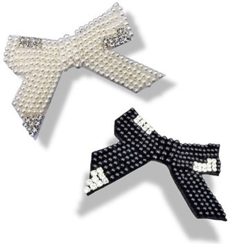 Applicazione a forma di Fiocco, realizzato con perle e con particolari in strass crystal.H: 9 cm x 6,5 cm .
