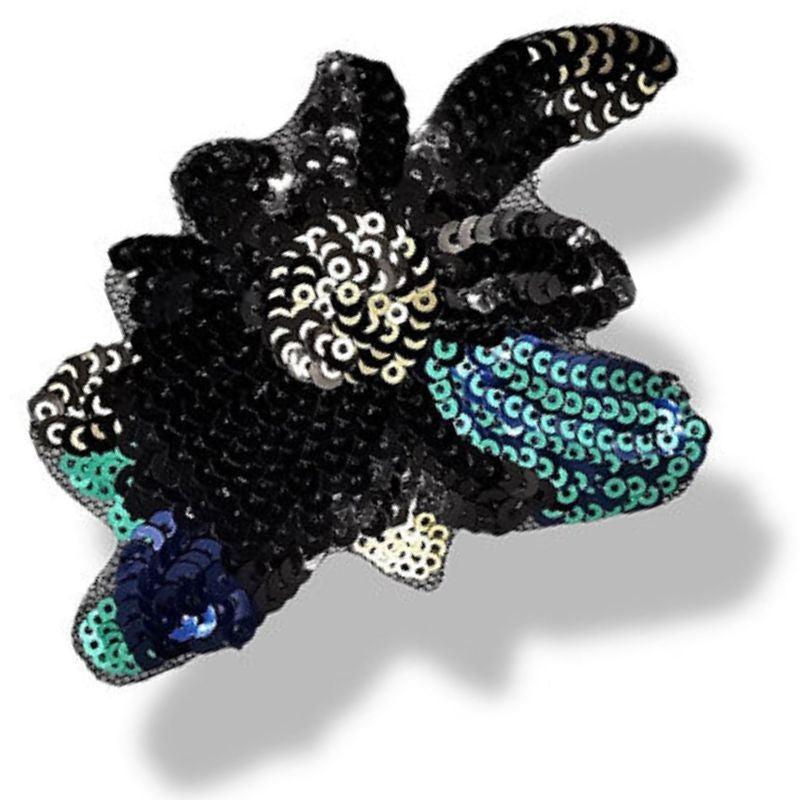 Applicazione realizzata con paillettes ricamate interamente a macchina e raffigurante un Fiore.H: 11 cm x 7,5 cm .