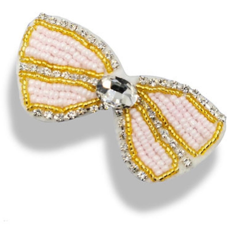 Applicazione a forma di Fiocco, realizzata con una pietra crystal al centro, file di corallini ricamati a mano e file di strass che delineano i bordi.H: 8 cm x 4 cm .