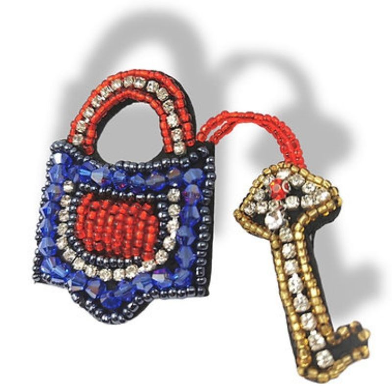 Applicazione a forma di Lucchetto con Chiave pendente interamente composta da Strass in Vetro e Corallini cuciti a mano. H: 5,5 cm x 4 cm