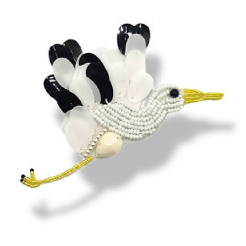 Applicazione raffigurante una Cicogna, realizzata con file di corallini, paillettes ricamate e pietre.H: 12cm x 11 cm