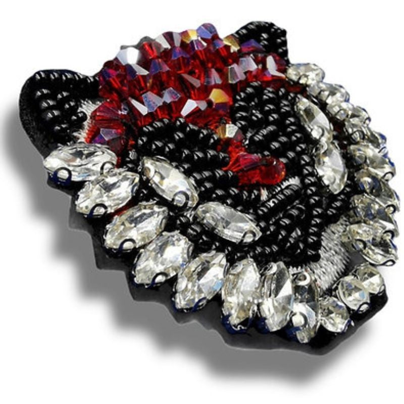 Applicazione termoadesiva a forma di Tigre ricamata e decorata con Pietre in Vetro e Corallini cuciti a mano. H: 5 cm x 4,3 cm