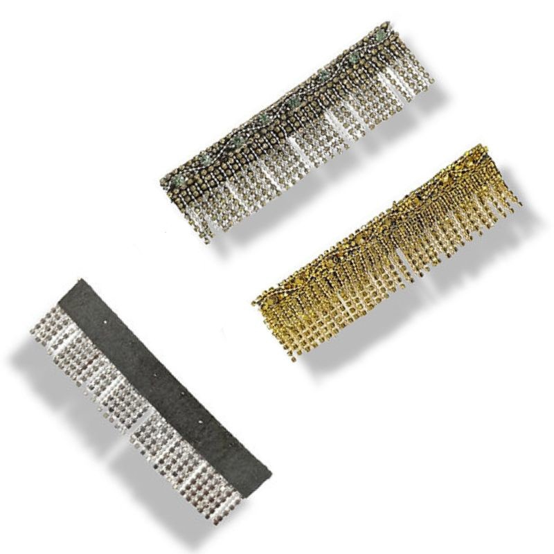 Applicazione di forma rettangolare, realizzata su base panno lenci, con pietre, file di strass e file di microsfere che formano la parte pendente.H: 3,5 cm x 12 cm