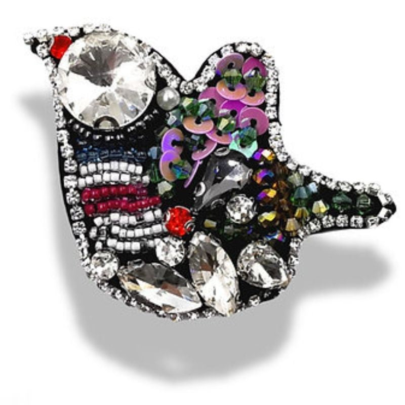Applicazione raffigurante un volatile, realizzata con paillettes, file di corallini, pietre e una fila di strass che ne delinea il bordo.H: 7,5 cm x 5 cm