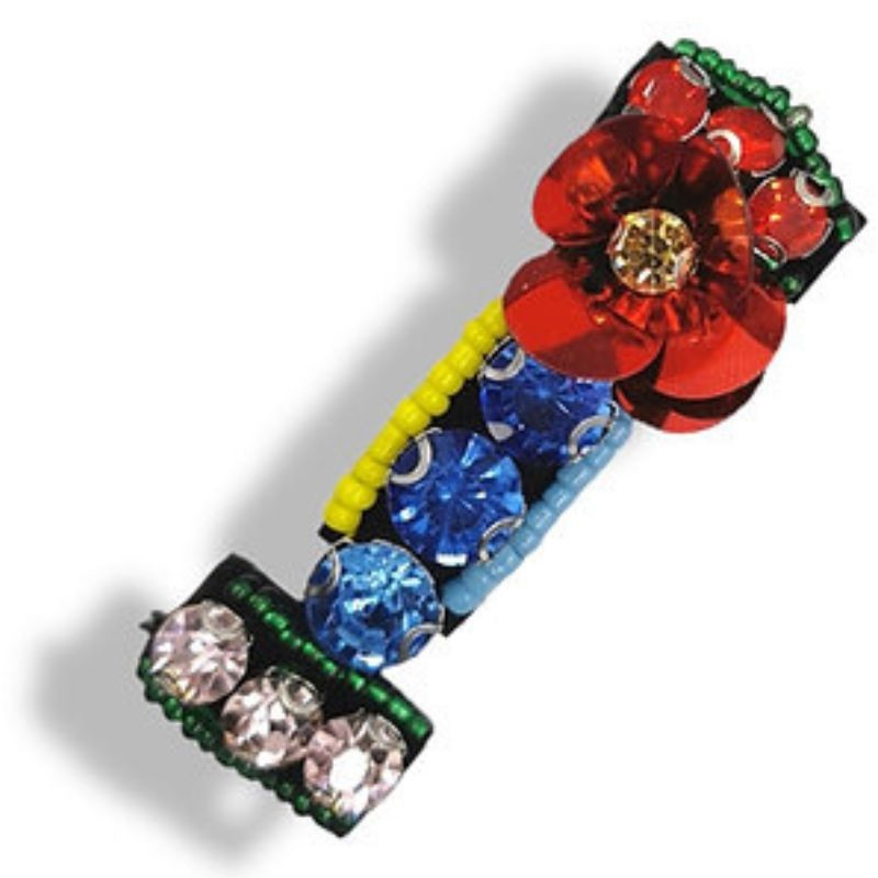 Applicazione a forma di lettera " I " , realizzata con pietre, file di corallini ricamate e un fiore, formato da paillettes e una pietra centrale.H: 5 cm x 2 cm