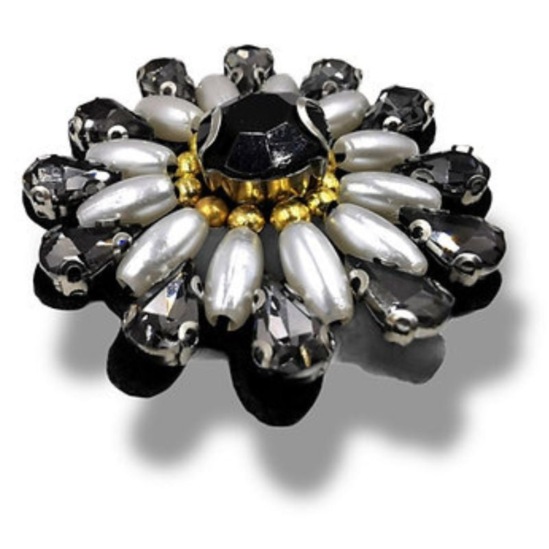 Fiore Tondo Cucito a Mano con Perle e Pietre in Vetro Black Diamond. H: 4cm x 4cm.