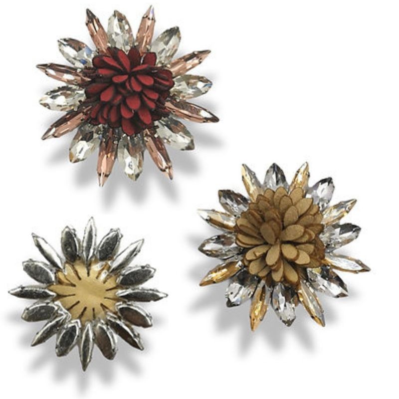 L' applicazione ha come base una pellicola adesiva ed è realizzata con pietre singole a chicco di riso con castone e un fiore in tessuto di camoscio come inserto.H: 4,5 cm x 4,5 cm