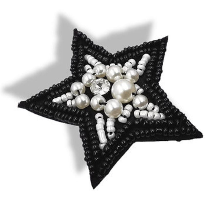 Applicazione a forma di Stella, realizzata con perline, corallini e due catene di corallini neri che ne delineano il bordo.H: 6 cm x 5,5 cm