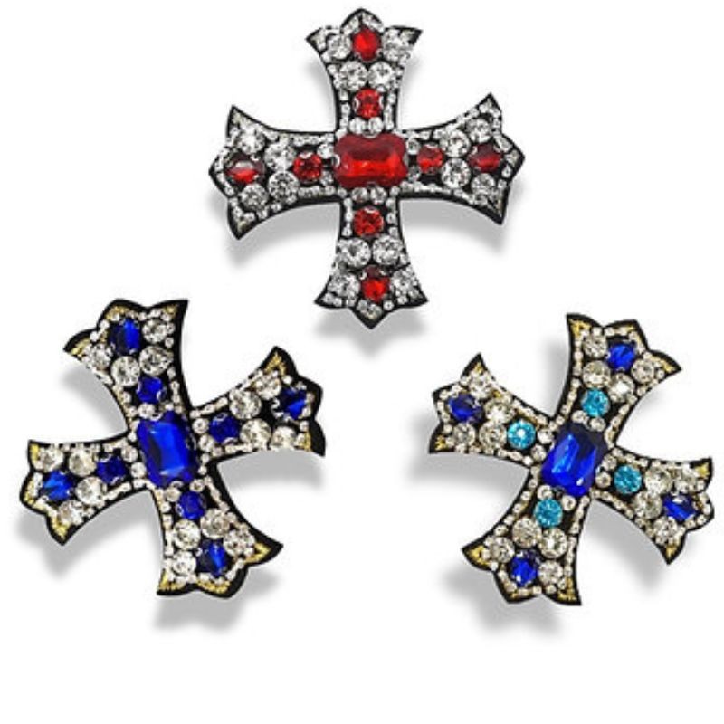 Applicazione interamente ricamata a macchina, raffigurante una Croce, realizzata con pietre colorate e crystal, e una catena di strass crystal ai bordi del ricamo.H: 8 cm x 8 cm