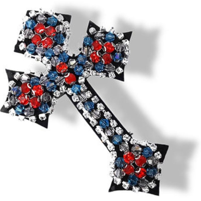 Applicazione a forma di Croce, realizzata con pietre, corallini e una fila di strass che ne delinea i bordi.H: 6,5 cm x 9,6 cm