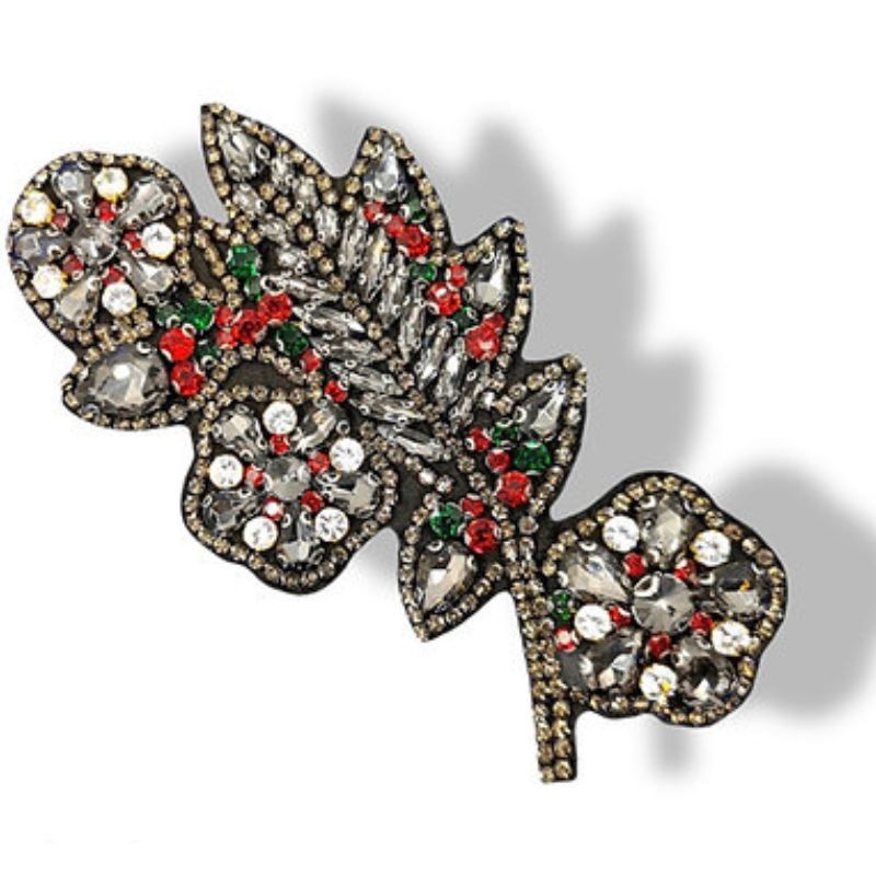 Applicazione a forma di Foglia,interamente cucita a macchina, realizzata con pietre e file di strass.