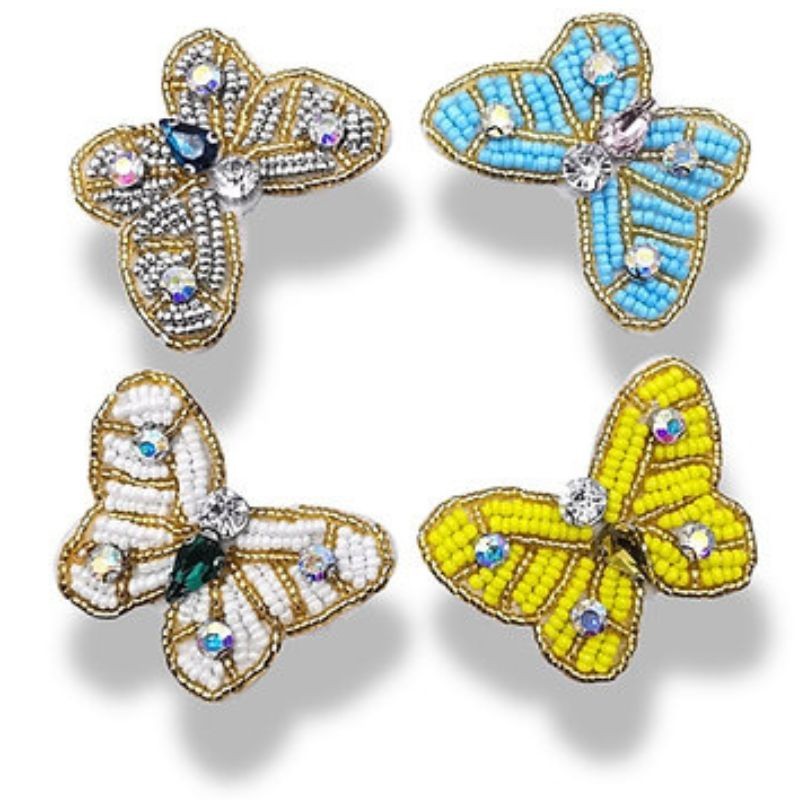Applicazione raffigurante una farfalla ad ali aperte, realizzata con pietre e file di corallini.H: 5,5 cm x 4 cm
