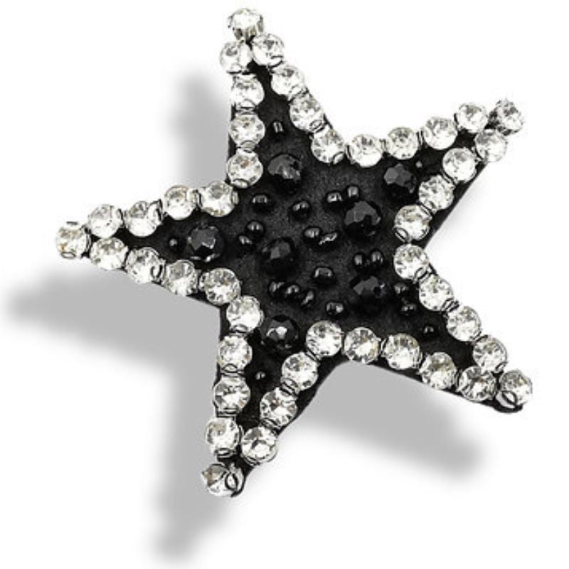 Applicazione a forma di Stella, realizzata con pietre e corallini neri e una catena di pietre crystal che ne delinea il bordo.H: 7 cm x 7 cm