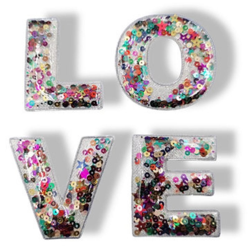 Applicazione termoadesiva raffigurante la scritta LOVE, realizzata in pvc e all'interno sono presenti paillettes colorate in varie forme.H: Lettere 5,5 cm x 5,5 cm