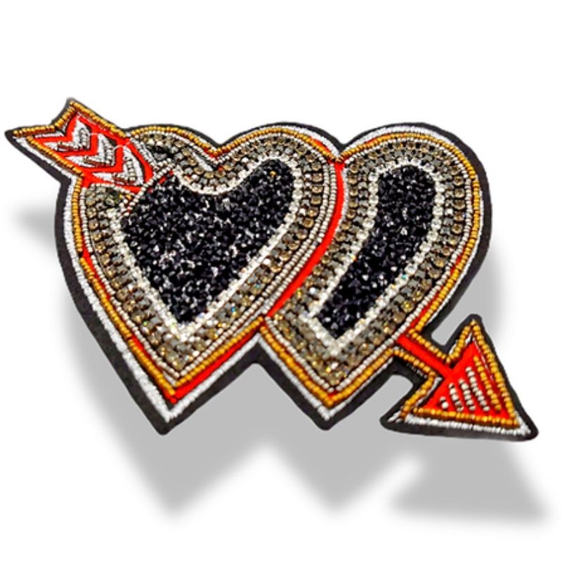 Applicazione termoadesiva raffigurante un Cuore e una Fraccia, entrambi ricamati e arricchiti da file di strass e file di corallini.H: 12,3 cm x 9 cm