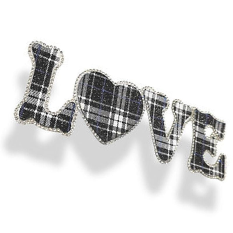 Applicazione termoadesiva raffigurante la scritta " LOVE ", patchgrande realizzata in tessuto scozzese glitterato, mentre i bordi sono delineati da file di strass.H: 19 cm x 5,7 cm