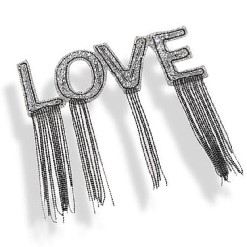 Applicazione termoadesiva raffigurante la scritta " LOVE ", patchgrande realizzata con paillettes ricamate mentre file di strass ne delineano i bordi. I pendenti sono formati da catene di microsfere.H: 20 cm x 7 cm, pendenti 11 cm