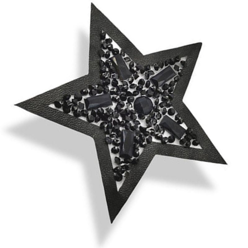 Applicazione termoadesiva raffigurante una stella, la parte centrale è composta con varie pietre, mentre esternamente è realizzata in ecopelle. H: 8 cm x 8 cm
