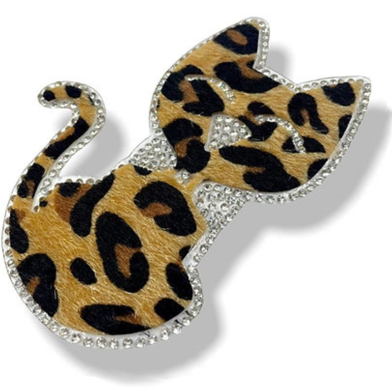 Applicazione termoadesiva raffigurante un gatto, realizzata con strass crystal su tessuto maculato effetto cavallino.H: 10 cm x 7 cm.