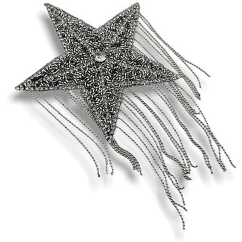Applicazione termoadesiva raffigurante una stella realizzata con canottiglie, pietra in vetro centrale, file di strass e pendenti composti da microsfere.H: 10 cm x 10 cm, pendenti esclusi.