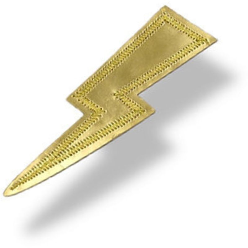 Applicazione termoadesiva raffigurante un Fulmine, realizzata su base eco-pelle dorata lucida e con i bordi ricamati con filo lurex oro.H: 3 cm x 8,7 cm