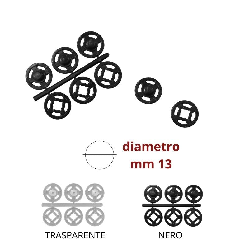 Bottone automatico in plastica di diametro mm 13, si applicano cucendoli. Il prezzo è riferito alla stecca da 3 bottoni.