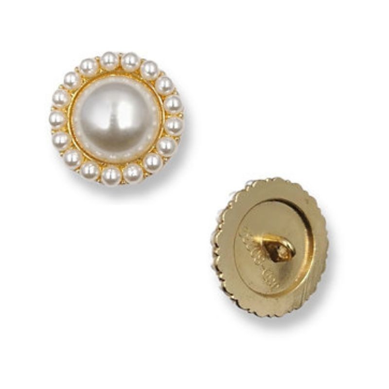 Bottone su base oro di forma circolare, composto da una perla centrale, avvolta da un giro di perline da 2 mm.Circonferenza 23 mm 36 L