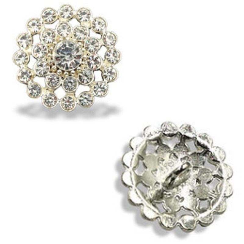 Bottone gioiello realizzato con pietre in vetro crystal, con pietra grande al centro e pietre piccole che la circondano, elettrosaldate su base argento.Circonferenza : 20 mm 36L