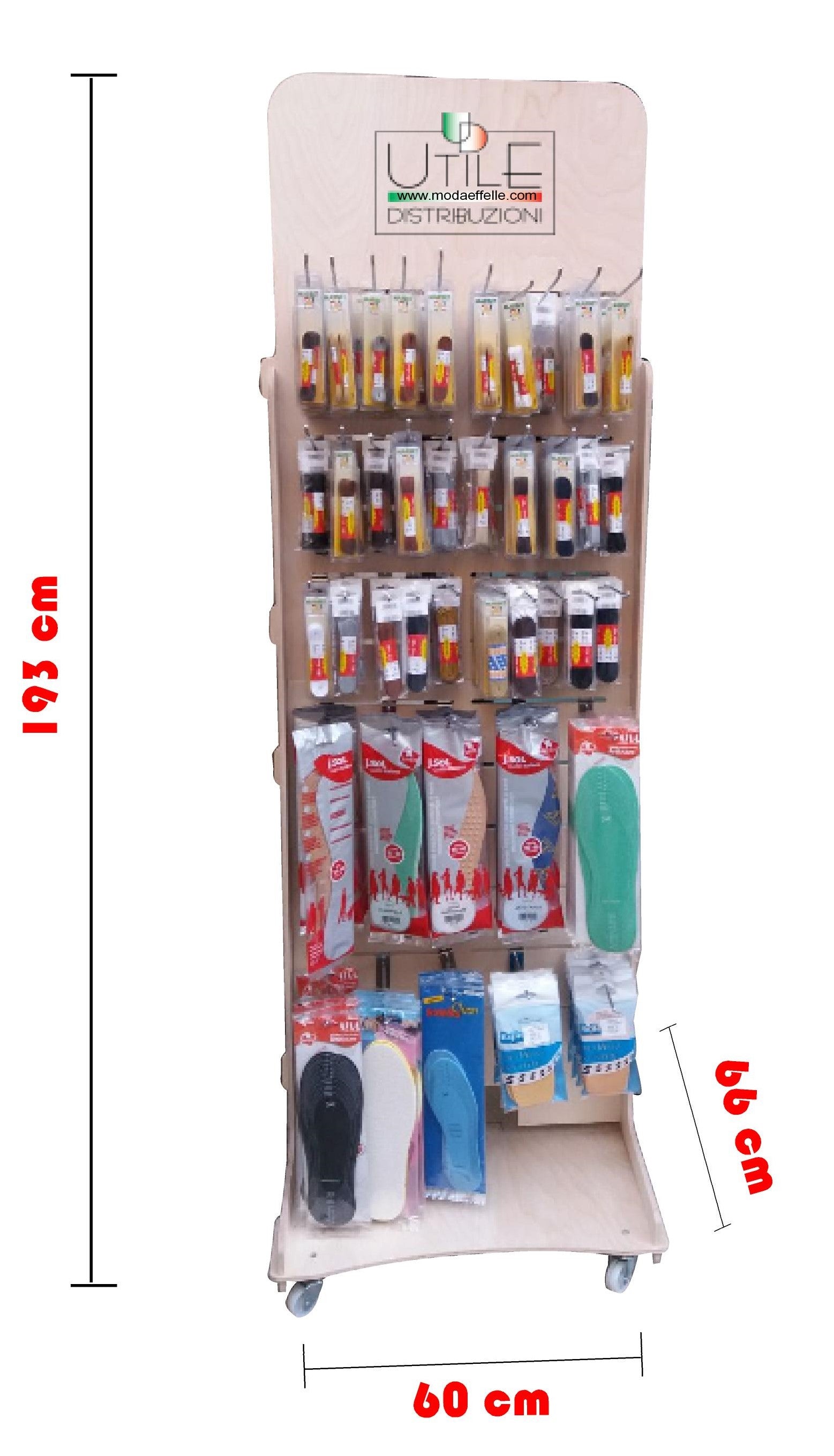 Pratico espositore in legno per negozio con rotelle che ne facilitano lo spastamento, assortimento inerente a lacci e solette. Misure dell espositore H 193 cm Profodo 33+33 cm(fronte retro) L 60 cm