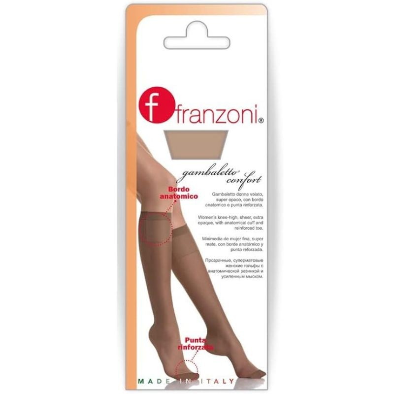 Gambaletto donna velato opaco 20 den, Brand Franzoni. La taglia è unica, grazie al suo bordo anatomico, garantisce un ottima vestibilità sulla gamba e soprattutto non stringe il polpaccio. Composizione 90% poliamide e 10% elastan.