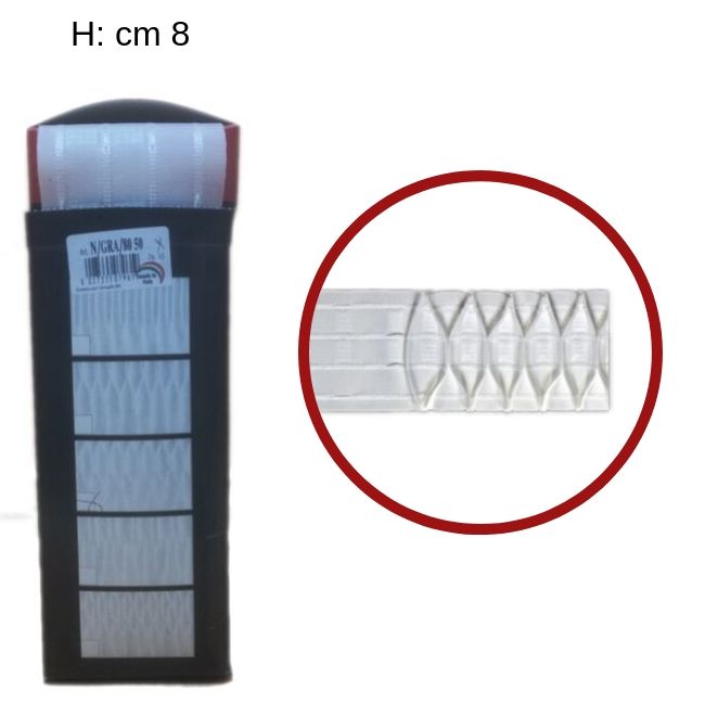 Nastro arricciatenda cm 8, composizione 100% poliestere, a 2 tasche e 4 fili tiranti, modello a nido d' ape. Il prezzo è riferito alla confezione da 50 metri.
