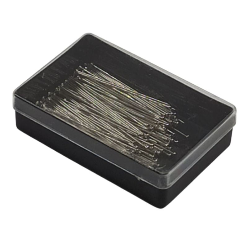 Spilli misura mm 0,60 di diametro e lunghezza 32 mm, scatola contenente 200 spilli in acciao dolce di colore argento. Prodotto di importazione. Prezzo riferito a confezione di 200 spilli