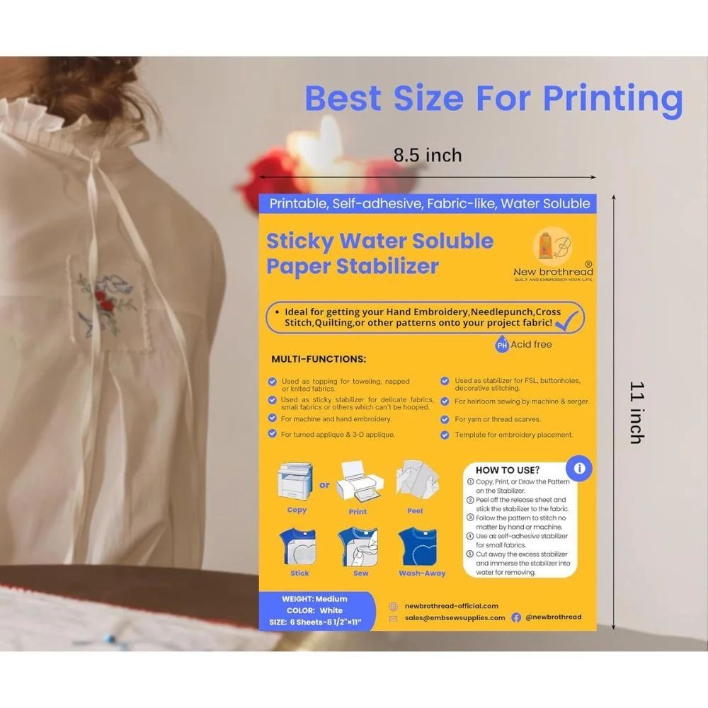 Stabilizzatore idrosolubile adesivo di peso medio, formato (A4) 21 x 29,5 cm. Compatibile con stampanti inkjet per la stampa diretta di modelli o per il disegno manuale. Adatto a ricamo a mano e a macchina. Si dissolve completamente in acqua senza residui, garantendo supporto durante la lavorazione e una finitura pulita